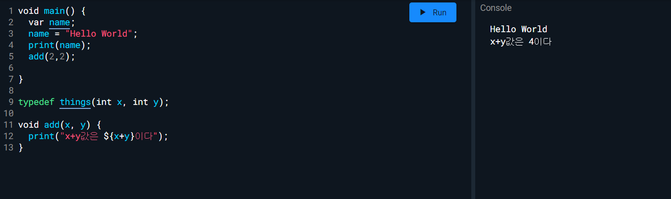 Dart언어 공부를 위해서 https://dartpad.dev/?id 여기서 그냥 적어서 연습하면된다.