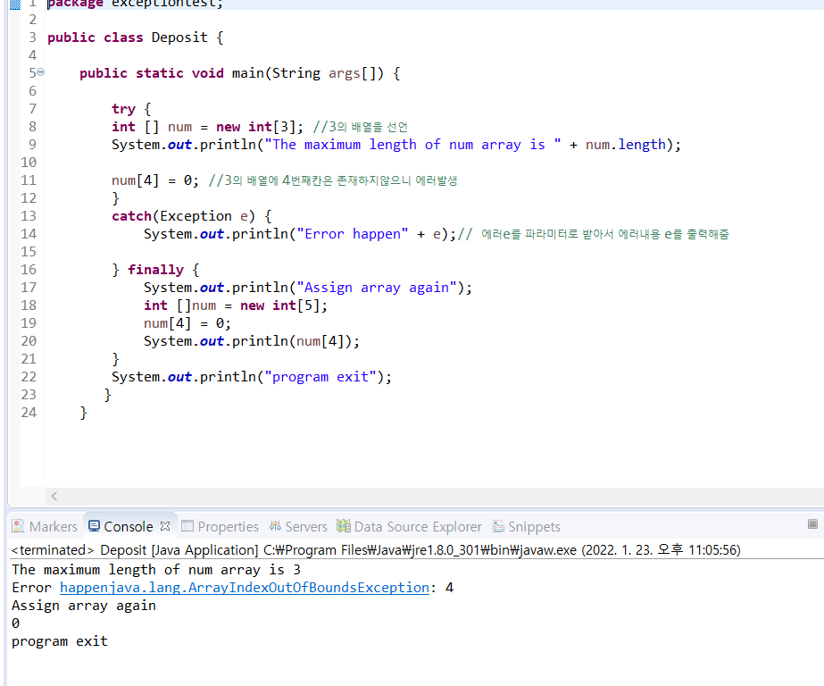 이럴경우를 대비해서 try catch finally 문을 쓴다. 다만 finally는 예외처리를떠나 무조건실행하게하는것이다.